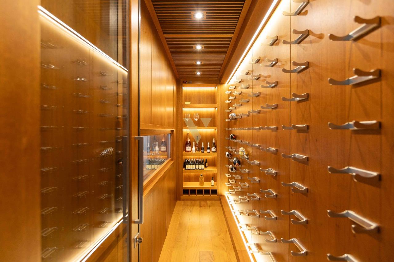 Possui adega climatizada e sala de estar integrada ao espaço gourmet, com uma vista definitiva e muito arborizada.