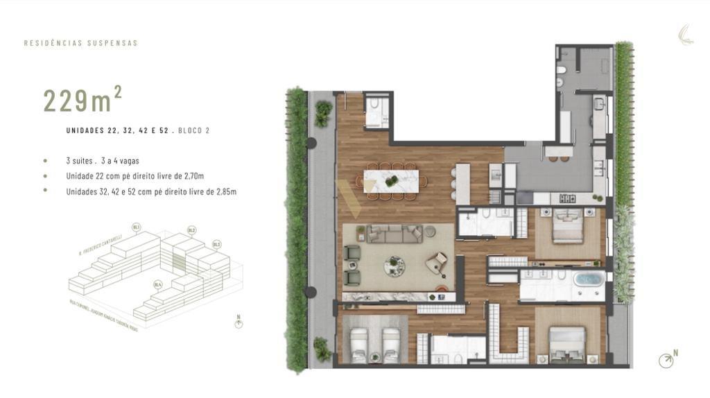 Esta é uma unidade com 229 m2 privativos, três suítes, três vagas de garagem, depósito privativo e face norte.