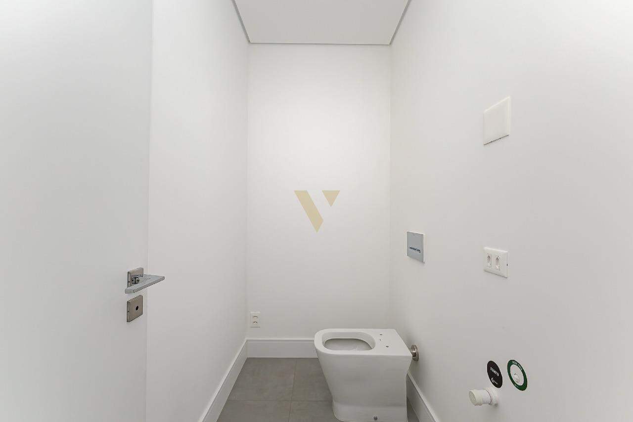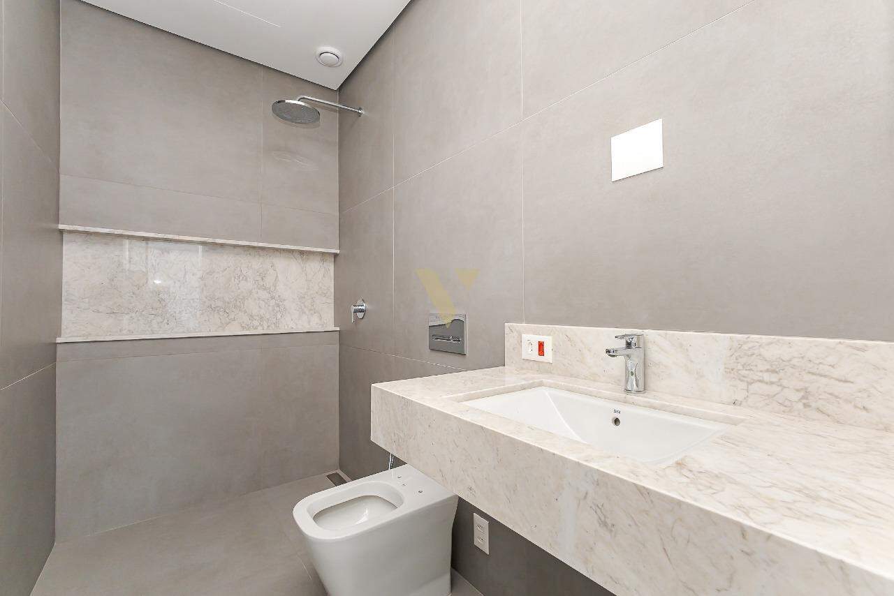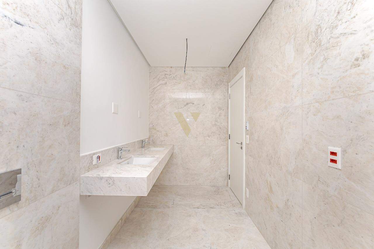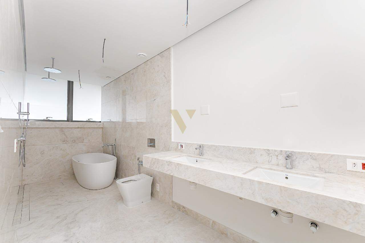 O banheiro da suíte master é um destaque à parte, com acabamentos em mármore branco, cubas e chuveiros duplos, banheira freestanding e louças de alto padrão.