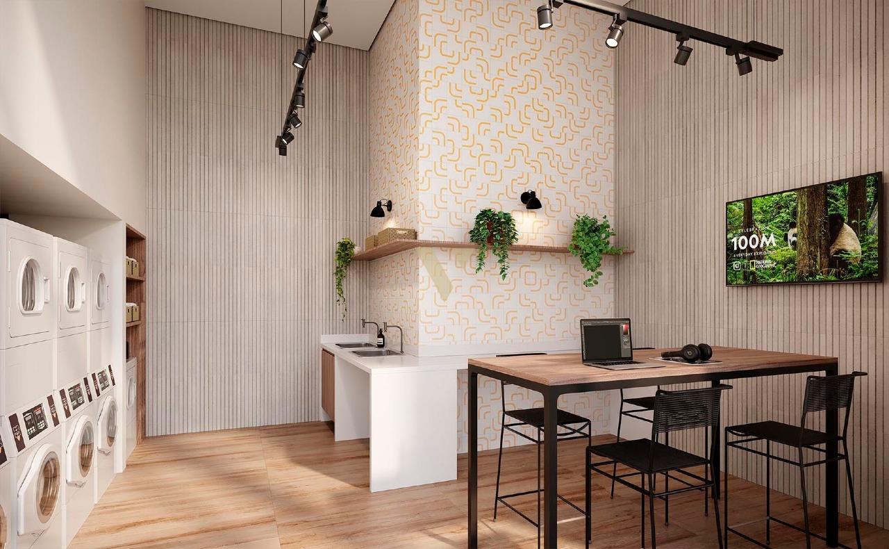 Entre os diferenciais estão lavanderia com equipamentos industriais, espaço delivery, infraestrutura para ar-condicionado, tomadas USB e fechadura biométrica, reforçando o conceito de praticidade e modernidade.