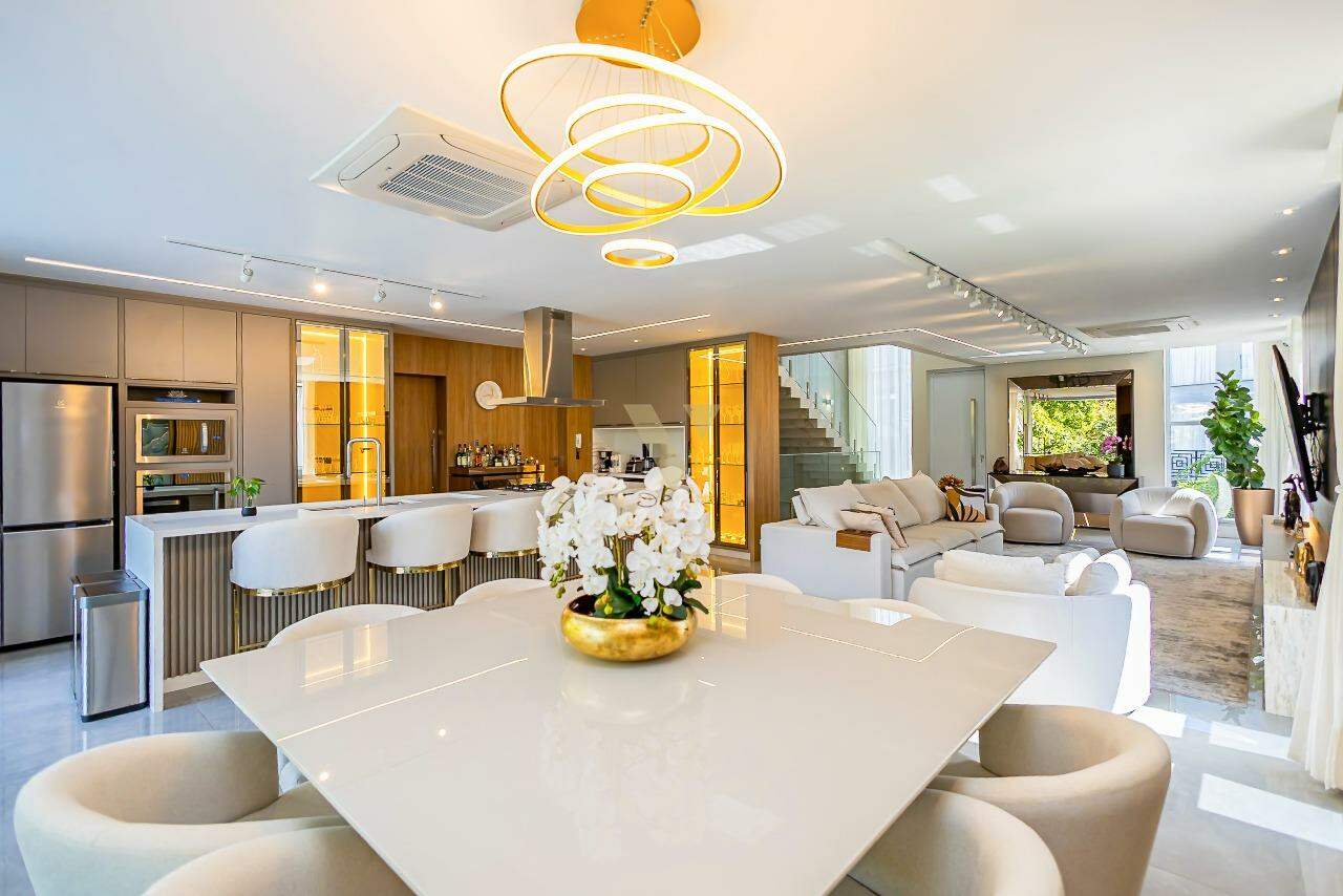 Com uma ampla área construída de 534 m2, a residência integra seus espaços de forma perfeita. O living generoso se conecta à cozinha em conceito aberto e ao espaço gourmet, ideal para momentos de convívio com amigos e família e equipado com churrasqueira e uma ampla piscina. A área se completa com lavabo, dispensa, lavanderia e um banheiro para suporte à piscina;